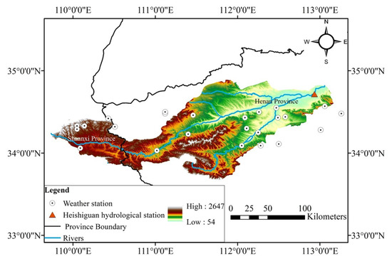 The Yiluo River flows through Shaanxi and Henan provinces, involving 21 counties and cities in the two provinces, with a total length of 974.0 km and a drop of 4480 m. The geographical location is located at 109°45′~113°06′ E and 33°33′~35°05′ N (Figure 1). The Yiluo River Basin is located in a continental monsoon climate zone with dry and windy spring, high temperature, and rainy summer, fine and cool autumn, as well as cold and dry winter. The average annual precipitation is 660 mm, of which approximately 410 mm is received during the flood season from June to September, accounting for approximately 60% of the annual precipitation [31]. The Yiluo River is composed of the Luo River and Yi River, which is a typical twin river, among which the Luo River originates in Luonan County at the southern foot of Mount Huashan in the Qinling Mountains, with a total length of 410 km; the Yi River originates in Zhangjia Village in Luanchuan County in the Xionger Mountain area of the eastern branch of the Qinling Mountains and is injected into the Luo River at Zaozhuang in Yanshi city, with a total length of 268 km [13]. The basin covers an area of 18,881 km2, with mountains accounting for 52.4%, loess hills accounting for 39.7%, and alluvial plains (valleys) accounting for 7.9%. The upper reaches of the watershed are mountainous areas with good vegetation cover, while the lower reaches are covered with loess, with relatively sparse vegetation and more serious soil erosion [31]. There are 24 meteorological stations in and around the basin, and the Heishiguan hydrological station is located at the outlet section of the basin, as shown in Figure 1.