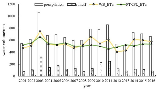 Comparison of precipitation, runoff depth, and evapotranspiration calculated by water balance and evapotranspiration calculated by the PT-JPL model from 2001 to 2016.