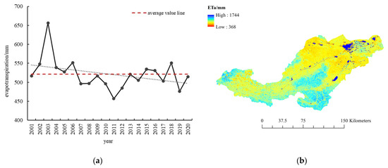 According to the actual evapotranspiration of each pixel from 2001 to 2020, the total actual evapotranspiration of the basin from 2001 to 2020 was obtained statistically (Figure 3a). The interannual fluctuation of the total evapotranspiration in the Yiluo River Basin was large; the maximum value of 656.6 mm appeared in 2003, and the minimum value of 457.2 mm appeared in 2011. The total evapotranspiration of the basin showed a decreasing trend with a multiyear average value of 521.3 mm and a decrease rate of 2.5 mm/a, which was basically consistent with the findings of Gu, Guan [42] Gu, Guan [42] Gu, Guan [42].
