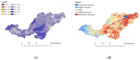 Superimposing the classification results of the Theil–Sen trend analysis and Mann–Kendall trend test, the statistical results were divided into 5 types: S greater than or equal to 0.001 and Z greater than 1.96 as significantly increased; S greater than or equal to 0.001 and Z at −1.96 to 1.96 as slightly increased; S between −0.001 and 0.001 and Z at −1.96 to 1.96 as stable; S less than −0.001 and Z at −1.96 to 1.96 as slightly decreased; S less than −0.001 and Z less than −1.96 as significantly decreased.
