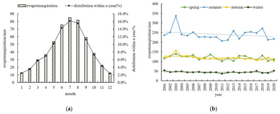 Based on the calculated actual monthly evapotranspiration for each image from 2001 to 2020, the multiyear monthly average actual evapotranspiration in the Yiluo River Basin from January to December (Figure 4a) and the actual evapotranspiration in spring (March–May), summer (June–August), autumn (September–November), and winter (December–February) for each year (Figure 4b) were calculated. In terms of distribution within a year, ETa in January and December were the two lowest months in a year, and ETa in July was the highest month in a year. In terms of seasonal variation, ETa varied significantly among the four seasons, with the highest ETa in summer, followed by spring and autumn, and lower ETa in winter. From the variation trend, evapotranspiration showed a decreasing trend in all four seasons, and the rate of decrease was the fastest in summer.