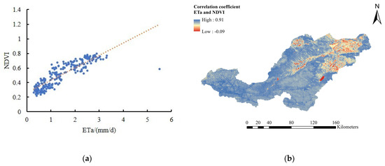 - The monthly trends of actual evapotranspiration were consistent with the vegetation growth pattern and the intra-annual variation process of temperature and precipitation. Monthly ETa correlated well with monthly temperature, monthly NDVI, and monthly precipitation, with ETa having the strongest correlation with temperature. This was contrary to the results of the interannual variation in ETa, NDVI, P, and T (ETa and P both showed a decreasing trend, and NDVI and T both showed an increasing trend).
