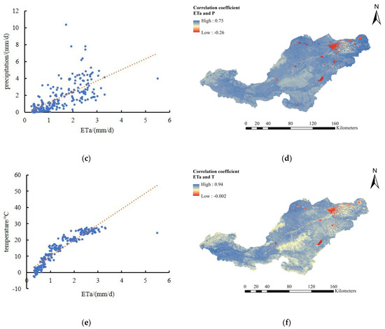 The state of the substratum vegetation is an important factor influencing the actual evapotranspiration process, temperature and precipitation changes affect the regional hydrothermal distribution, and the actual evapotranspiration changes are in turn closely related to the hydrothermal variation pattern [43]. Therefore, to investigate the causes of evapotranspiration changes in the Yiluo River Basin, normalized difference vegetation index (NDVI), precipitation (P) and mean temperature (T) were selected for correlation analysis of actual evapotranspiration in the Yiluo River Basin. The correlation analysis of ETa with the influencing factors was carried out based on month-by-month data, and the monthly values were averaged over the entire basin. The scatter distributions of correlations between ETa and NDVI, P, and T by Pearson correlation analysis are shown in Figure 5a,c,e, respectively. ETa was positively correlated with NDVI, P, and T, with correlation coefficients of 0.87, 0.66, and 0.93, respectively (all passed the 0.01 significance test), indicating that temperature may be the dominant factor affecting ET variation. The spatial distribution of the correlation coefficient between ETa and NDVI, P, and T is shown in Figure 5b,d,f, and the proportion of the watershed area in the areas showing significant positive correlation reached 99%. From the spatial distribution of the correlation coefficient between ETa and NDVI, P, and T, the areas with negative correlation and low correlation coefficient were mainly distributed around towns, reservoirs, and rivers in the downstream area. In general, ETa has a positive correlation with NDVI, precipitation, and temperature in the Yiluo River Basin. The correlation coefficient between ETa and NDVI was −0.09 to 0.91, with an average value of 0.74; the correlation coefficient with precipitation was −0.26 to 0.75, with an average value of 0.63; and the correlation coefficient with air temperature was −0.002 to 0.94, with an average of 0.87. From the correlation analysis results, ETa showed the best correlation with temperature, followed by NDVI and then precipitation.