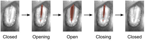 Speech and voice disorders become more and more common in the 21st century. The voice is formed by the oscillation of the two vocal folds within the larynx. The vocal folds oscillate on average between 100 Hz (males) and 300 Hz (females) for normal phonation, but can reach up to 1581 Hz during singing [1]. A normal voice or phonation is assumed to be produced by symmetric and periodic vocal fold oscillations [2,3]. Additionally, glottis closure during vocal fold oscillations is assumed to be important for normal voice (see Figure 1) [4]. To capture and assess vocal fold oscillations, digital high-speed video systems have now been used for more than 30 years [5]. Many studies applied HSV imaging to subjectively assess and judge vocal fold vibrations [6,7]. To quantitatively assess and judge vocal fold oscillations in HSV data, image-processing techniques have been suggested to segment the glottal area or detect the vocal fold edges over time (see Figure 1), being requisite for subsequent computation of quantitative parameters [8,9,10,11,12]. The first image-processing approaches go back to the 1990s, where classical image-processing techniques such as region growing were suggested [13]. Since then, many other classical image-processing techniques as thresholding [14], edge detection [15,16], or active contours [17,18] have been successfully applied. These classical image-processing techniques have been further developed [19] and combined with machine learning methods, e.g., active contours with k-means-clustering [20]. Machine learning methods and especially computationally expensive deep neural networks (DNN) have become more and more popular due to the computational performance increase of computers and, in particular, the effective use of graphics processing units (GPUs) [21]. Specifically, convolutional neural networks (CNNs) based on the U-Net architecture [22] are a popular and commonly used method for glottis segmentation in HSV videos [23,24,25].