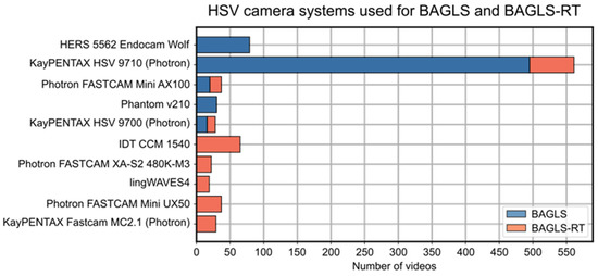 The new BAGLS-RT data set contains 267 HSV videos from eight different cameras and institutions, yielding 21,050 annotated images. The BAGLS-RT data set expands the BAGLS data set with five new cameras (Figure 2), four new light sources, one flexible endoscope, one new frame rate, and 14 new spatial resolutions, see Table A1, Table A2, Table A3, Table A4 and Table A5 for details. The subject distribution is as follows: mean age 42 ± 20 years, age range 18–93 years, 177 females and 90 males, 154 patients with healthy voices, and 123 patients with various pathologies, see Table A6. All recordings were performed during sustained phonation.