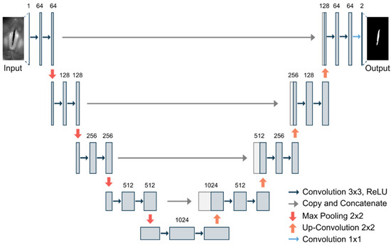 U-Net (3.2): The U-Net is a commonly used convolutional neural network for image segmentation [22]. Using skip-connections within the encoder–decoder architecture allows for effective and fast learning based on a relatively small data base [34]. The basic structure of the U-Net is illustrated in Figure 3.