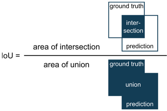 Evaluation of segmentation performance: For judging image segmentation performance we used the commonly applied Intersection over Union (IoU) [26]. The IoU is a metric that quantifies the overlap between the ground truth (manually annotated data) and the prediction of the U-Net. It divides the overlapping pixels of prediction and ground truth by the sum of all pixels (Figure 4). Thereby, IoU = 1 means perfect prediction.