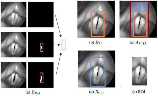 Region of Interest Method (ROI): For resizing the images to the desired 2:1 scale (based on the glottis geometry), the following new approach was performed. Within each video, bounding boxes were generated and combined to BRef, enclosing all included segmentation masks (Figure 6a). Afterwards, the smallest (B2:1 ≥ BRef) and largest possible bounding boxes in the desired 2:1 scale were determined, defining the boundaries of available ROIs (Figure 6b,c). The region of interest (ROI) for each image may now be an automatically and randomly chosen box BVar within the defined area, yielding more variety in training data regarding the position of the glottis in the image as well as surrounding information (Figure 6d,e).