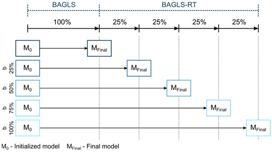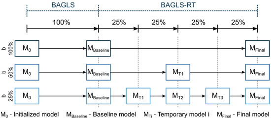 Here, a baseline model, trained solely with BAGLS data, was used as the starting model. Then, only the BAGLS-RT data were used to re-train this model, commonly known as finetuning. To simulate continuous new data, based on this finetuning concept, incremental learning was simulated using different batch sizes b = {25%, 50%, 100%} of BAGLS-RT (Figure 8). This means for, e.g., b = 25% that four incremental finetuning steps were performed, as shown in the bottom row of Figure 8.