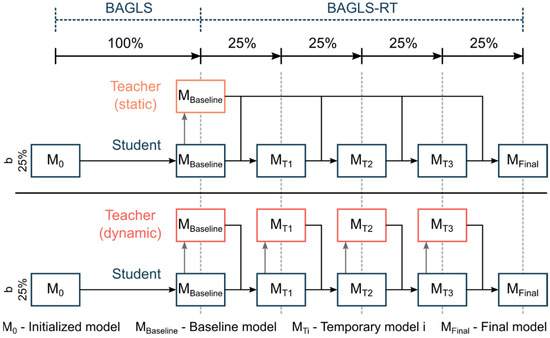 Here, the model performance is judged by considering the Dice Loss of both the baseline model previous to re-training (teacher-model) and the Dice Loss for the model currently being re-trained (student-model). The influence of the teacher-model is controlled by a parameter α ∈ [0, 1]. The higher the α value is chosen, the smaller the influence of the teacher-model during re-training, i.e., α = 1.0 corresponds to the same incremental finetuning as described above in Section 2.5.2. For a detailed description of the FKD approach, we refer to refs. [39,40,41]. The training data were chosen as described in Section 2.5.2, i.e., only BAGLS-RT. We chose a balanced value with α = 0.5 and investigated three batch sizes b = {25%, 50%, 100%}. Additionally, we considered (1) a static model, where the teacher-model is always the baseline model, and (2) a dynamic model, where the teacher-model is replaced after each batch with the student-model (Figure 9). Consequently, the static and dynamic model for the batch size b = 100% are equivalent.