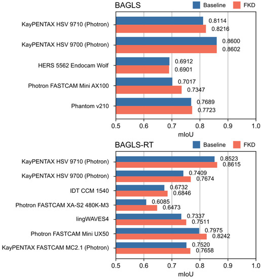 Since the FKD approach showed the best re-training performance, additional results are provided separately for each camera system. Figure 10 shows the results of finetuning with knowledge distillation with a batch size of b = 100% (i.e., dynamic and static teacher model are equivalent) for each camera system in the BAGLS and BAGLS-RT datasets. Compared with the baseline model, FKD achieved an increase in segmentation performance for all camera systems with the exception of one camera in the BAGLS dataset. Overall, improvements in mIoU were larger for camera systems in the re-training dataset BAGLS-RT (0.92% to 3.88%) than for BAGLS (0.03% to 1.02%). The highest increase in performance (∆mIoU = 3.88%) could be observed for the Photron FASTCAM XA-S2 480K-M3, which was the only system used in combination with a flexible endoscope, yielding what are arguably the most novel data for the segmentation model, as videos recorded with flexible endoscopes were not included in BAGLS.