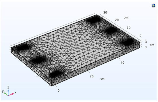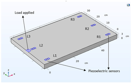 The structural design and mechanical stress-induced voltage measurements are all performed in COMSOL Multiphysics. The design structure has a length of 50 cm, a width of 30 cm, and a thickness of 3 cm where 6 piezoelectric sensors are distributed equidistantly all over the structure as follows: 3 sensors to the right side of the structure and 3 sensors to the left (Figure 1). The structure and the sensors are made of wood and Lead Zirconate Titanate (PZT-5H) (piezoelectric material), respectively. The sensor design is brought from a commercial sensor of dimensions 3.18 cm length, 1.27 cm width, and 0.51 mm thickness. A rectangular shape of 2 cm length, and 2.5 cm width is defined on the surface of the structure to simulate the surface contact of the load to be applied. Thus, the 6 sensors measure the potential difference (voltage) for each change in the load magnitude and position.