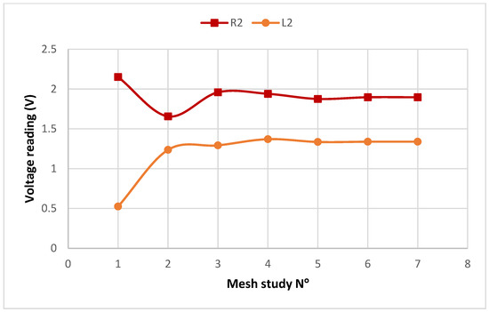 The values of the potential difference measured by the sensors L2 and R2 are given in Figure 3. One can notice that the voltage values for each of these sensors are fluctuating for Studies 1 to 4 with an average error of 23.35%. However, in Studies 6 and 7, the voltage values of each sensor are converging to the same result with an average error of 1.1%. Considering this, we can verify the simulation outcomes based on the parameters established in Studies 6 and 7. We then proceed with our study using the same mesh parameters as in Study 6.