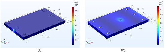 The locations of the six piezoelectric sensors distributed all over the structure are kept fixed, and the sensors’ voltage readings for different speeds are acquired by changing the load mass and position. It is important to visualize the stress distribution all over the structure with load change of position (Figure 4) and to analyze the voltage values collected by the sensors.