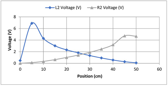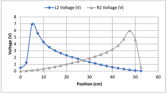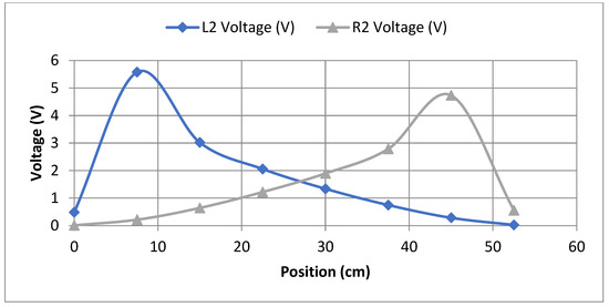 L2 and R2 sensors’ voltage reading in term of load position.