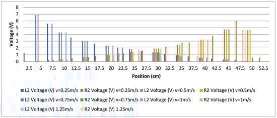 Figure 11 combines L2 and R2 sensors’ voltage readings corresponding to load speeds of 0.25 m/s, 0.5 m/s, 0.75 m/s, 1 m/s, and 1.25 m/s. More possible speeds could be presented. This figure can be used to point out how the generated data can be useful for speed prediction. The voltage values collected by the six sensors (six input parameters) defined in the structure, for each change in load mass and position, create a set of data that can be used to define a speed detection model. Table 3 illustrates a demo version of the data set and how this data can be prepared for speed classification, where rows 2–10 are continuous with each other and correspond to the same input set definition for speed prediction. This table presents the input parameters data provided by the six sensors for two different load masses (40 kg and 45 kg) and for all studied load positions that correspond to a load speed of 0.5 m/s, 0.75 m/s, and 1 m/s. The voltage readings correspond to the load speed “v”, where each load speed corresponds to its specific load position due to the distance step. As given in Table 3, zero voltage reading corresponds to the case where the load is not observed due to the distance step effect. The effect of the mass on the voltage readings provided by all the sensors can be seen clearly in this table. The voltage values are increasing with the mass load for different speeds. This is also true for different positions. Data input values presented in Table 3 can be customized depending on needs. Here, we are only presenting a demo version of the full data set.