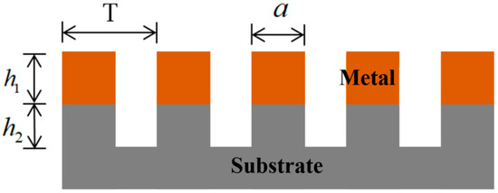 Figure 4 shows the section diagram of the designed double-layer metal grating structure; that is, the substrate is also etched to a certain depth. In the diagram, T is the grating period, and a is the grating width, h1 and h2 are the wire grid depth and zinc selenide depth, respectively.