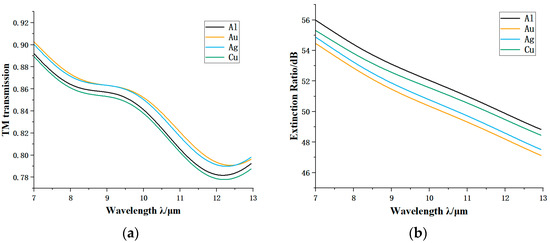 The selection of grating wire materials will also affect the polarization performance of grating. This paper compares the effects of aluminium, gold, silver, and copper as wire grating materials on the transmittance and extinction ratio of TM waves in the incident band of 7~13 μm. According to the comparison and analysis in Figure 6, the TM wave transmittance of the four materials is close. When gold is used as the wire gate material, TM wave transmittance is slightly higher than that of the other three metals, but the extinction ratio is low. In contrast, when aluminium is used as the wire gate material, the extinction ratio is significantly higher than that of the other three materials. Therefore, in overall consideration, the selection of aluminium as the wire grid material is more appropriate.