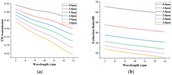 In the critical period, six wavelength grating periods are selected for simulation. Figure 7 shows TM wave transmissivity and extinction ratio under different grating periods. When the grating period increases, the TM wave transmissivity and extinction ratio decrease significantly, so the grating period should be selected as small as possible. Considering the current process level, the grating period is determined as 1 μm.