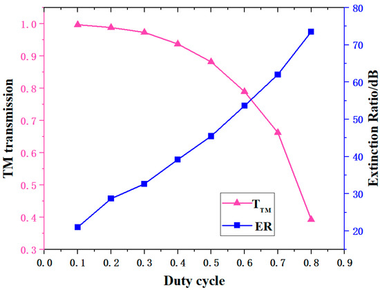 The duty cycle of the grating is defined as the ratio of grating width to the grating period. The polarization performance of the grating was analyzed by normal incident light with a centre wavelength of 10 μm and a duty cycle ranging from 0.1 to 0.8. Figure 8 shows the trend of grating polarization performance with the duty cycle. It can be seen that the transmittance of TM decreases gradually with the increase of the duty cycle. When the duty cycle is more significant than 0.6, TTM (the transmittance of TM) decreases faster, while the extinction ratio increases rapidly with the addition of the duty cycle. Therefore, to ensure that the transmittance of TM wave and extinction ratio of the grating reach a high level, the duty cycle is set as f = 0.5.