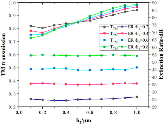 As shown in Figure 9, h1 is 0.2 μm to 0.8 μm, and TTM and the extinction ratio change with h2. It can be seen that no matter how much h1 is taken, TTM increases with h2, while the extinction ratio hardly changes with h2. The change of h1 has little influence on TTM. The TTM levels at the four times are similar, but the influence on the extinction ratio is very obvious. The larger the value of h1 is, the greater the extinction ratio is. When h1 is 0.8, the extinction ratio is significantly higher than the other three times. In conclusion, in order to meet the requirements of a large extinction ratio and obtain high transmittance, the value of h1 should be between 0.6 and 0.8, and h2 should be as large as possible in line with the process level.