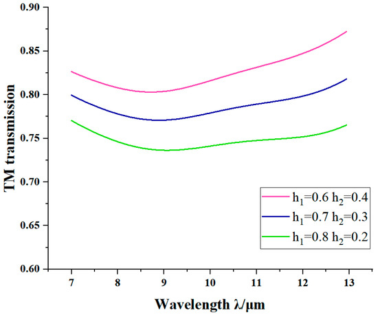 As shown in Figure 10, the linear chart of TM wave transmissivity under three groups of values is shown. When h1 = 0.6 and h2 = 0.4, the transmittance can reach more than 80%, and the extinction ratio can reach about 45. Finally, the values of each parameter of the designed grating are placed in Table 3.