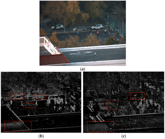 Figure 12 is a traditional visible light image and a long-wave infrared polarization image of a scene about 500 m away. It can be seen from the polarization degree image in Figure 12b that the contrast between people in action and the background is very high due to their radiation. The sidelines of the sports field ground can also be clearly seen. The metal plates on the fence are very obvious, and the polarization effects of car windows and car bodies parked outside the fence are apparent. From the polarization angle image in Figure 12c, it can be observed that the detailed contour information of the target is highlighted. With the reduction of the imaging distance, the detailed information of the target is more abundant, especially the eaves carving lines near are clear. The experimental results show that long-wave infrared polarization imaging can detect and identify targets at the same time and improve the contrast of targets. The infrared polarization imaging technology combining polarization information and infrared radiation information can improve the operating range of the imaging system.
