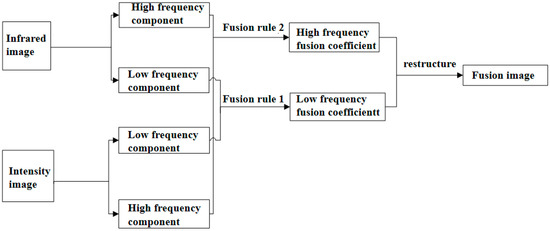 Based on the advantages of infrared polarization imaging detection technology, this paper uses three methods to combine long-wave infrared and visible near-infrared. The fusion image flow is shown in Figure 13. The preliminary fusion of infrared and intensity images is achieved using wavelet transform [19]. The purpose of fusion rule 1 is to complete the fusion of low-frequency information of two source images, and fusion rule 2 is to achieve the fusion of high-frequency components of two source images. Then use the colour migration algorithm to enhance the pseudo colour of the image to make the target scene more prominent [20].