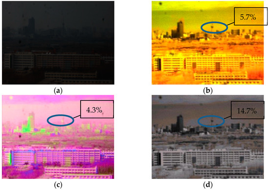 Contrast of visible light imaging and fusion effect. (a) Ordinary intensity imaging. (b) Fusion effect picture 1. (c) Fusion effect picture 2. (d) Fusion effect picture 3.