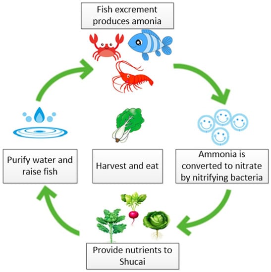 Aquaponics refers to the novel combination of aquaculture and hydroponic culture [16]. The ecological cycle principle is illustrated in Figure 1. The cycle begins with the excrement (ammonia) discharged from aquatic animals, which is dissolved through aquaculture water. Then, a submerged motor pumps the aquaculture water to a filtration system to filter large excrement. Afterwards, the aquaculture water is flowed through a nitrification system [17]. The nitrification system contains a considerable number of nitrite bacteria, which can decompose ammonia and oxidize it into nitrates. In an anaerobic environment, it can be decomposed into nitrogen and oxygen to achieve nitrification. The aquaculture water is then drained into a plant-growing bed. As the plants’ roots absorb nitrogen fertilizer, the water is purified [18]. Then, the pure water is sent back to the bucket to rear aquatic animals, therefore not requiring large amounts of artificial fertilizers. There is no danger of pesticide residues, and the only requires regular maintenance of the entire aquaculture ecosystem to achieve a symbiotically productive environment for agriculture and fishery culture [18].
