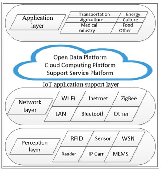 The IoT is a network formed by connecting real-world objects (such as vehicles, machines, and household appliances) through APIs or embedded sensors linked by various wireless or wired communication devices to provide communication and dialogue for management and other services [33,34]. The IoT architecture is mainly divided into four layers, including a perception layer, network layer, IoT application support layer, and application layer [35]. The four-layer architecture of the IoT is shown in Figure 3.