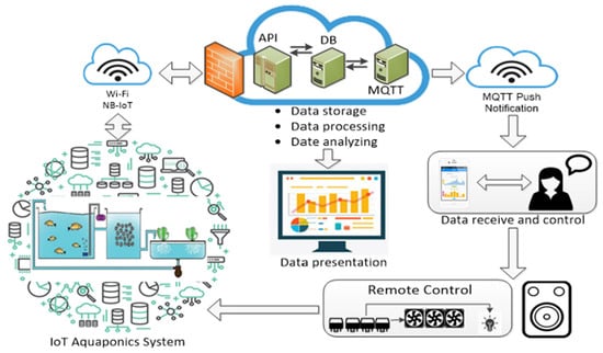 Aquaponics provides the following advantages: (1) saving manpower, with no crop rotation barriers; (2) environmental protection and water saving; (3) self-sufficient agriculture fisheries culture systems; (4) non-toxic, safe, and clean; (5) rapid growth of agriculture and fishery; and (6) energy savings and carbon reduction; among other benefits. Aquaponics systems are ideal for metropolitan communities with limited land [19]. In addition to the problem of an aging population and declining birthrate, as the country develops gradually toward urbanization and industrialization, most of young and middle-aged people will choose urban employment rather than working in the more difficult agriculture or farming industries. Therefore, many scholars have suggested that agriculture and fisheries should be combined the Internet of Things (IoT) technologies and wireless transmission technology for agricultural and fishery production, such as the in the research cases presented in [5,6]. IoT technology and sensors can be used to sense the water quality and soil conditions in such systems. The collected data can be transmitted to a device designated by the user through wireless transmission technology, such as Wi-Fi, ZigBee, Bluetooth, etc., allowing users to monitoring or analyze collected data and then adjust environmental factors based on the results of the analysis to achieve more ideal growth conditions for aquatic animals and crops.