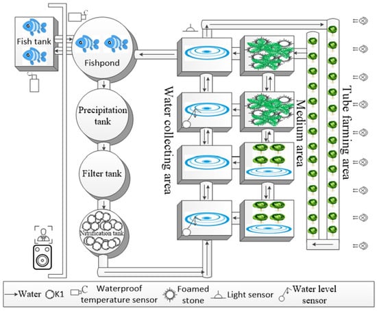 The main parts of the system consist of fish tanks, fishponds, a precipitation bucket, filter bucket, nitrification bucket, pipe farming areas, hydroponic areas, medium areas, and catchment areas. As shown in Figure 5, fishponds are mainly used for the cultivation of selected aquaculture, such as Wu Guo fish or Nile fish. The sediment barrels are mainly used to precipitate all cultivation water returned through the aquaponics system. Because the water may contain unfiltered impurities, it will be precipitated during this process. After the cultivation water passes through the sedimentation barrels, it will flow through the filtration bucket. At this stage, the unfiltered impurities will be filtered with a finer filter material, and the cultivation water will be sent to the nitrification barrels. The role of the nitrification buckets is to decompose ammonia in fish excrement or residual feed. Because the nitrification system contains a considerable amount of nitrite bacteria, ammonia can be decomposed and oxidized into nitrate, which is then decomposed into nitrogen and oxygen by anaerobic bacteria. Then, the cultivation water is sent to the pipe cultivation area, the hydroponic area, and the medium area to allow the plants to absorb nitrogen fertilizer, completing the entire aquaponics cultivation system with circulating water.