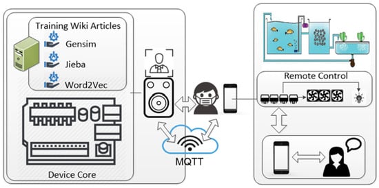 The SGCS proposed in this study includes a facial recognition and voice control system located between care areas and aquaponics systems, the main function of which is to provide caregivers with control over staff movements and to identify the elderly when they enter the therapeutic environment. Figure 10 shows a schematic diagram of the face recognition system, which is integrated with the intelligent voice control system (IVCS) proposed by Wang et al. [7]. The voice control interface allows the elderly to talk to the APP provided by this study to control the environment through the core of the cloud voice system. Because identification has been carried out, human–computer interaction with the elderly is possible, with records documenting the interactions. The records are integrated into the activity history of the personal care resume. These activity history records provide the medical team and the nurses with a physical fitness analysis as a reference for rehabilitation care.