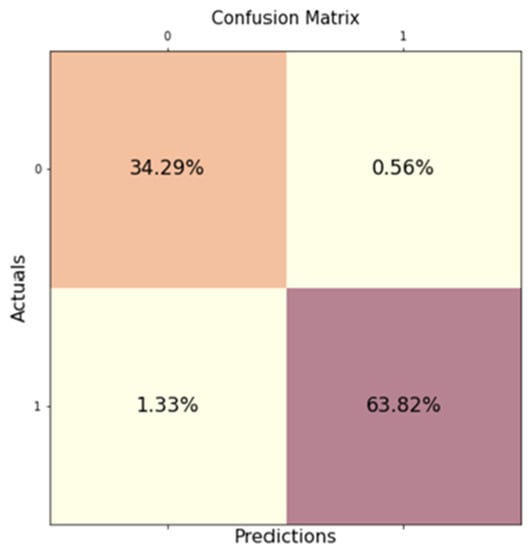 Table 4 shows that the average prediction accuracy of the automatic control model established in this study is as high as 96.8%. Based on the accuracy rate, the control model can accurately predict the functions of experts in maintaining various systems of the aquaponics environment. In addition to the accuracy evaluation to confirm that the automatic control model can accurately control the device, there is no overfitting problem, so the automatic control model prediction was evaluated using a confusion matrix. The confusion matrix of the automatic control model prediction Device04 is shown in Figure 14.