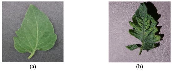 The figure shows the data for a complete day; the blue line represents the air temperature data, the orange line represents the marked data, and an index of 0 represents the data at 00:00 in the morning. To facilitate viewing of the data, the marked values 0 and 1 represent two states, i.e., off and on, and the numerical value is enlarged to a value of 40, representing the on state, with a value of 28 representing the off state. The results show that the device is set to be on when the sun is not rising, and it is turned off when the sun is high in the sky, around noon. Open source leaf pathology data from the PlantVillage data set [57] was used to train the leaf pathology detection model. This function mainly uses the Tomato mosaic virus and Tomato healthy categories to build the pathology detection model. An example of the data set is shown in Figure 17a,b.