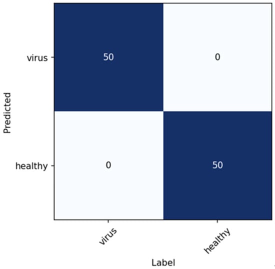 The x-axis in Figure 18 represents the data label, and the y-axis represents the prediction result of the model. When the prediction result is equal to the label, the data are correctly classified. This figure shows the leaf pathological identification model constructed in this study in the form of a confusion matrix, where the prediction of the data set and the number of corresponding markers is tested. The results show that the leaf pathological identification model established in this study achieved an accuracy rate of 100% on the test data set. This model should be used to assist in identifying the health status of tomatoes grown in the experimental environment to achieve accurate identification results.