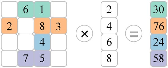 Sparse matrix–vector multiplication (SpMV) is of the form , where () is a sparse matrix, and () and () are dense vectors. Figure 1 gives a simple example of SpMV, where the number of non-zero elements () of is 8 and .