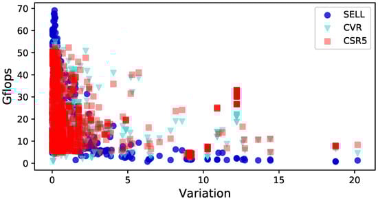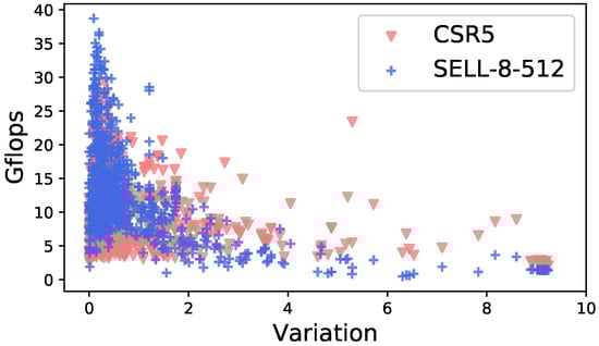 SpMV performance of SELL-8-512 and CSR5 for SpMV performs on matrices with different irregularities (variations). The larger the variation is, the more irregularity a matrix has.