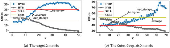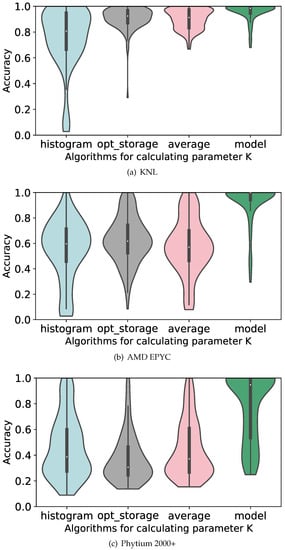 Figure 9 shows the performance comparison between our model and three existing analytical models (K_average, K_histogram and K_opt_storage [19]) on the three target architectures. The y-axis represents the achieved performance of the four K-selection methods in terms of accuracy calculated by Equation (1). For each matrix, the SpMV performance with the K obtained from one of the three methods is , and the SpMV performance with the best K is .