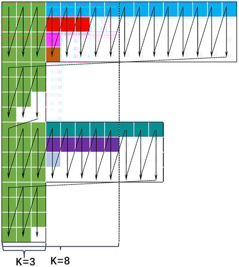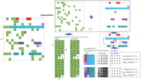 The key to representing a sparse matrix in the HYB5 format is to determine how to partition the matrix. As a first step, the input matrix A has to be divided into two sub-matrices, where their number of rows and columns are equal to those of matrix A. As shown in Figure 4, the size of the sub-matrices is 16 × 16. During matrix partitioning, we only have to save non-zero elements for both sub-matrices. The divided non-zero elements remain in their original locations for each sub-matrix. As we have mentioned, a partitioning parameter K is used to determine the position where to cut a row of the matrix. The first K non-zero elements are stored in the left sub-matrix. If there are fewer than K non-zeros, then all non-zero elements in this row are stored in the left sub-matrix. In Figure 4, K = 3 and the first three non-zero elements of each row are represented in SELL-C-. The remaining non-zero elements within this row are stored in the right sub-matrix in CSR5. The resultant HYB5 structures are outlined in the upper right-hand portion of Figure 4.