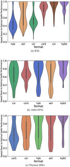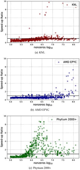We see that, for the three tested platforms, in general, the accuracy of our model is optimal, which is significantly better than that of , and . In terms of average accuracy, our model outperforms , and by 26.1%, 5.4%, and 7.7%, respectively, on KNL; 61.1%, 47.3% and 59.4%, respectively, on AMD EPYC; and 72.6%, 109.2% and 77.7%, respectively, on Phytium 2000+. Figure 7c shows that, although the native formats of HYB5 have a poor performance, our model on Phytium 2000+ can provide superior performance and still outperform the state-of-the-art formats. Note that yields better performance than on KNL (Figure 9a).