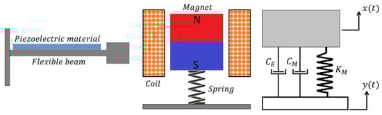 To find a common expression for PEH and EMEH power output, we use the second-order mass–spring–damper system and describe the proof mass movement of both PEHs and EMEHs, using Equation (1). Proof mass displacement is expressed as