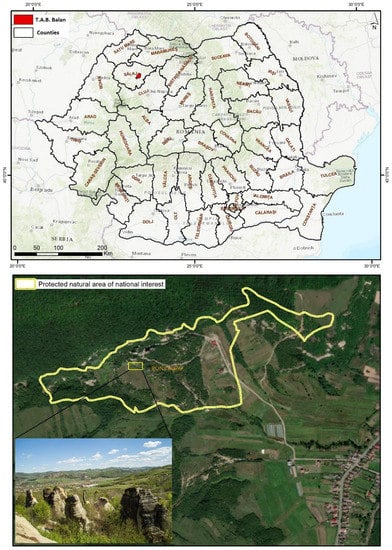 The analysed geomorphosite is very important at the regional level, and the geomorphosite is located approximately in a central position within the North-West Development Region of Romania, administratively within Sălaj County and Bălan commune (Figure 1).