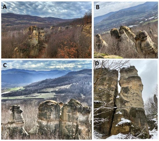 - Irimus, I.A.; Petrea, D.; Rus, I.; Pop, O.T.; Pop, C.C. Geomorfositul Grădina Zmeilor, Propuneri de Conservare și Valorificare Turistică, În vol. Geografia în Contextul Dezvoltării Contemporane; Presa Universitară Clujeană: Cluj-Napoca, România, 2009. [Google Scholar]