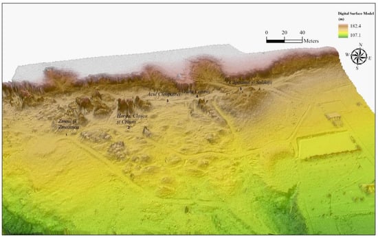 The main acquired databases were materialized in the DSM (Digital Surface Model), according to which we performed the morphological and morphometric (altitude and slope) analyses [83,84], as well as the digital cartography analysis (the orthophoto plan).