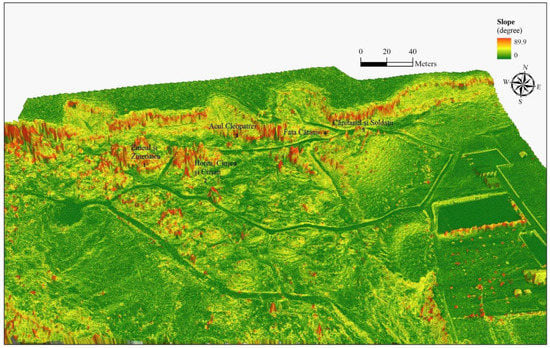 The analysis of the slopes generated on the basis of the DSM highlights the same spatial structures, characterised by high and very high slope values (Figure 5), delineated by structures with low slope values. Therefore, the structures in the shape of coiffed pyramids clearly stand out, as they are characterised by steep and very steep slopes, while there is an opportunity to design the space in between them in various proper ways for tourism, from the creation of visiting trails to the layout of leisure tourism infrastructure (access stairs, zip lines, etc.).