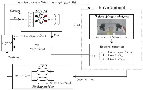 Reinforcement learning aims to find an answer to a given MDP (Markov decision process) problem. MDP refers to the process by which an agent interacts with the environment through actions using the current state, and obtains a reward. As a basic method of solving such an MDP, an optimization-based method is used in which an agent interacts with a probabilistic environment, selects an action, and maximizes the sum of rewards [32]. MDP is usually defined in the form of . S is the state set, A is the action set, P denotes the state transition probability, is the reward function, and is the discount factor [33]. The state transition probability represents the probability of transition to the next state when the action is taken from the current state s. The policy is the rule that determines how the agent interacts with the environment when it is in the current state s. A policy can be expressed as a probability distribution or a deterministic function. The agent interacts with the environment at every time step. The agent selects the action according to the policy and the state and injects it into the environment. The environment returns the next state and the reward to the agent according to the state transition probability based on the current state and injected action. The purpose of reinforcement learning is to use this procedure to iteratively update the policy so that the agent can receive the maximum reward sum until it approaches the optimal policy . That is, if the policy is updated with the optimal policy, = is established. There are two main ways to update the optimal policy. The first is value-based methods that update the optimal value function (i.e., the function that estimates the expected value of the reward sum) such as DQN (deep Q-network), DRQN (deep recurrent Q-learning for partially observable MDPs) using a neural network-like function approximation [34,35]. The action is chosen based on the value function. The second method, called the policy gradient method, learns the optimal policy directly from the agent’s experience. Policy-based learning is a method of determining the action a directly using the state s, rather than using a value function to determine the action. Representative methods of policy-based learning are REINFORCE, the actor-critic method, DPG (deterministic policy gradient), DDPG (deep DPG), A3C (asynchronous advantage actor-critic), TRPO (trust region policy optimization), PPO (proximal policy optimization), MPO (maximum a posteriori policy optimization), D4PG (distributed distributional DDPG), etc. [36,37,38,39,40,41,42,43]. Reinforcement learning mostly uses a mini-batch method for learning. In order to perform batch learning, we need to collect many data samples. A sample usually consists of a state , an action , a reward , and the next state . Moreover, many reinforcement learning algorithms rely on techniques that use samples in various specific ways for efficient learning. Typically, the replay buffer, PER (prioritized experience replay), and HER are mainly used [34,44,45]. This paper employs SAC as a reinforcement learning algorithm with HER for path planning of a multi-arm manipulator with both fixed and moving obstacles [46].