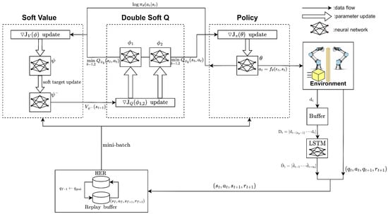 where means a temperature parameter that controls the weight for Q function and the entropy term . The Equation (4) is called a soft state function used in the SAC. Since the entropy term needs to be maximized, the gradient ascent should be used. So the sign is negative. The Equation (5) is a soft state-action function used in SAC. If the action is assumed to be finite, repeatedly executing the soft Bellman equation, Equation (5), with a given policy leads to a soft Q-function. In order to estimate the functions, the SAC uses neural networks. To create training data for the SAC networks, is obtained using the trained LSTM network using as an input. Using this, we created a state , obtained , and then interacted with the environment to store training data in replay buffer at each step. Specifically, the SAC utilizes five neural networks to estimate the policy, state value, and state-action value functions; see Figure 3.
