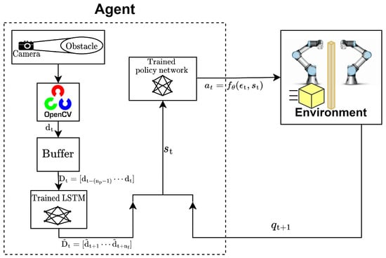 When the SAC-based path planning agent is successfully trained, the trained agent can generate the optimal path linking given arbitrary starting and goal points. Figure 4 describes how the trained SAC-based path planning agent generates the path. In other words, with the given starting point and the information on the position of the moving obstacle, the action is computed by the trained policy network and is applied to the robot. Then, the real robot changes each joint. The camera installed on top of the workspace measures the current position of the moving obstacle using the OpenCV library, and stores the measurements in a buffer. The trained LSTM uses the data within the buffer to calculate the prediction of the future position of the moving obstacle. Finally, the state including the current joint information and the prediction of the moving obstacle is given to the trained policy network and the procedure is repeated until the state reaches the goal point.
